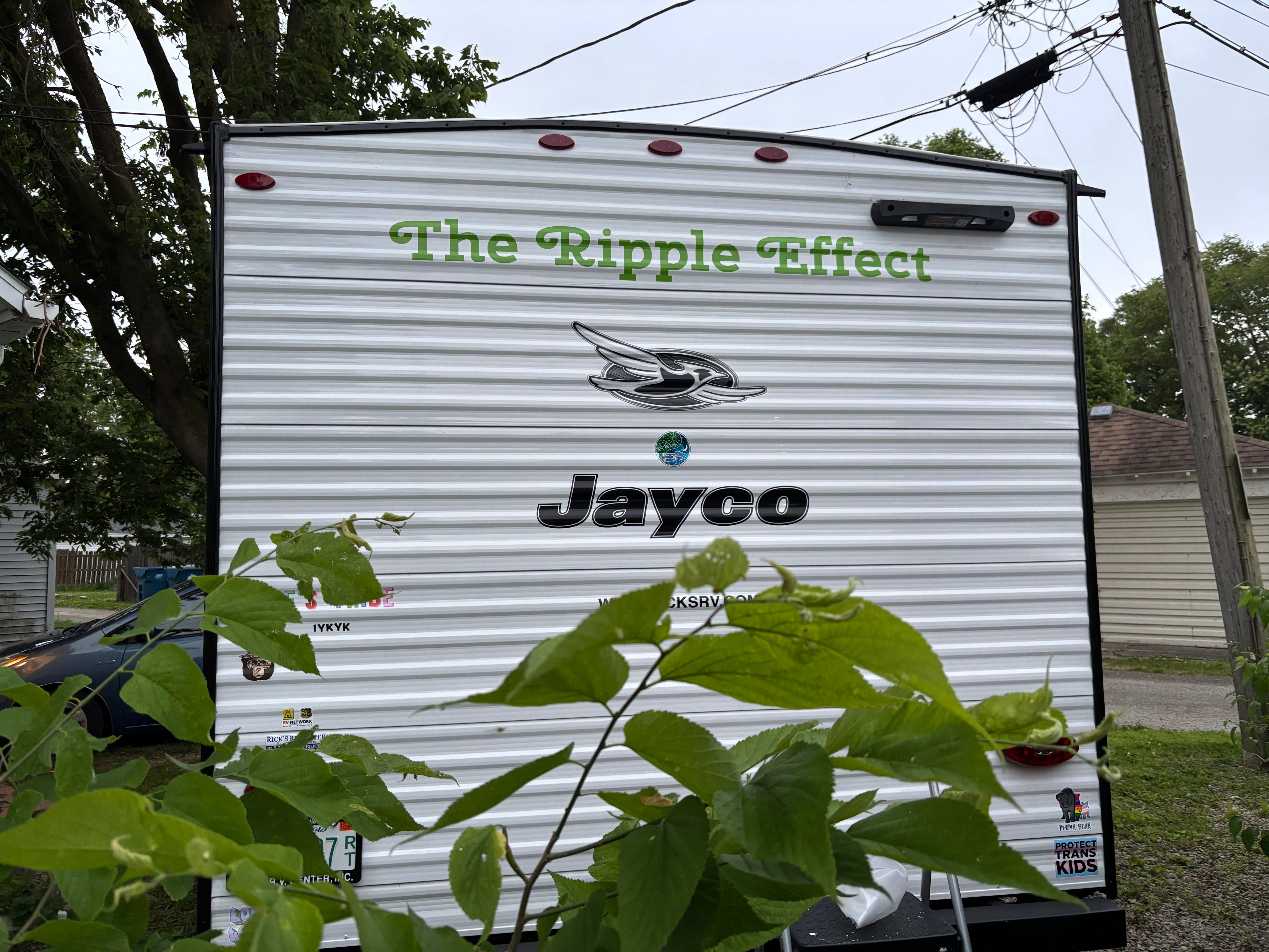 (Image of the back of the travel trailer, now sporting 7 inch tall letters saying “The Ripple Effect” - and the last letter ‘t’ is set slightly lower than the other letters)