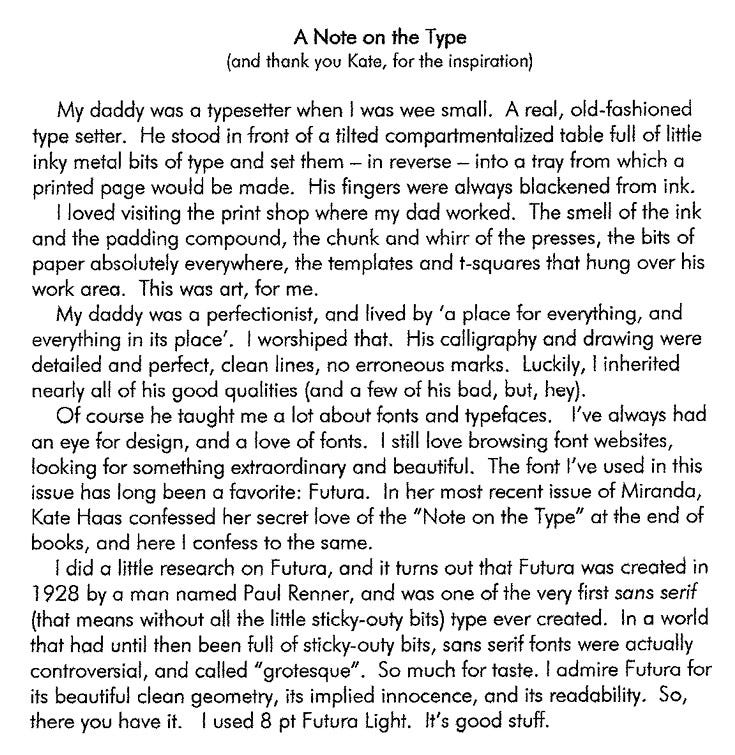Oh, yes, the zine. So, yeah, you can totally go read all the issues on my webpage, www.24hourmama.com. They are quite entertaining. In issue No. 6, I had so much content that I actually typed up one of the stories, and in the style of many old-school books, I wrote a little piece on my choice of font for that story. Here it is. Enjoy.