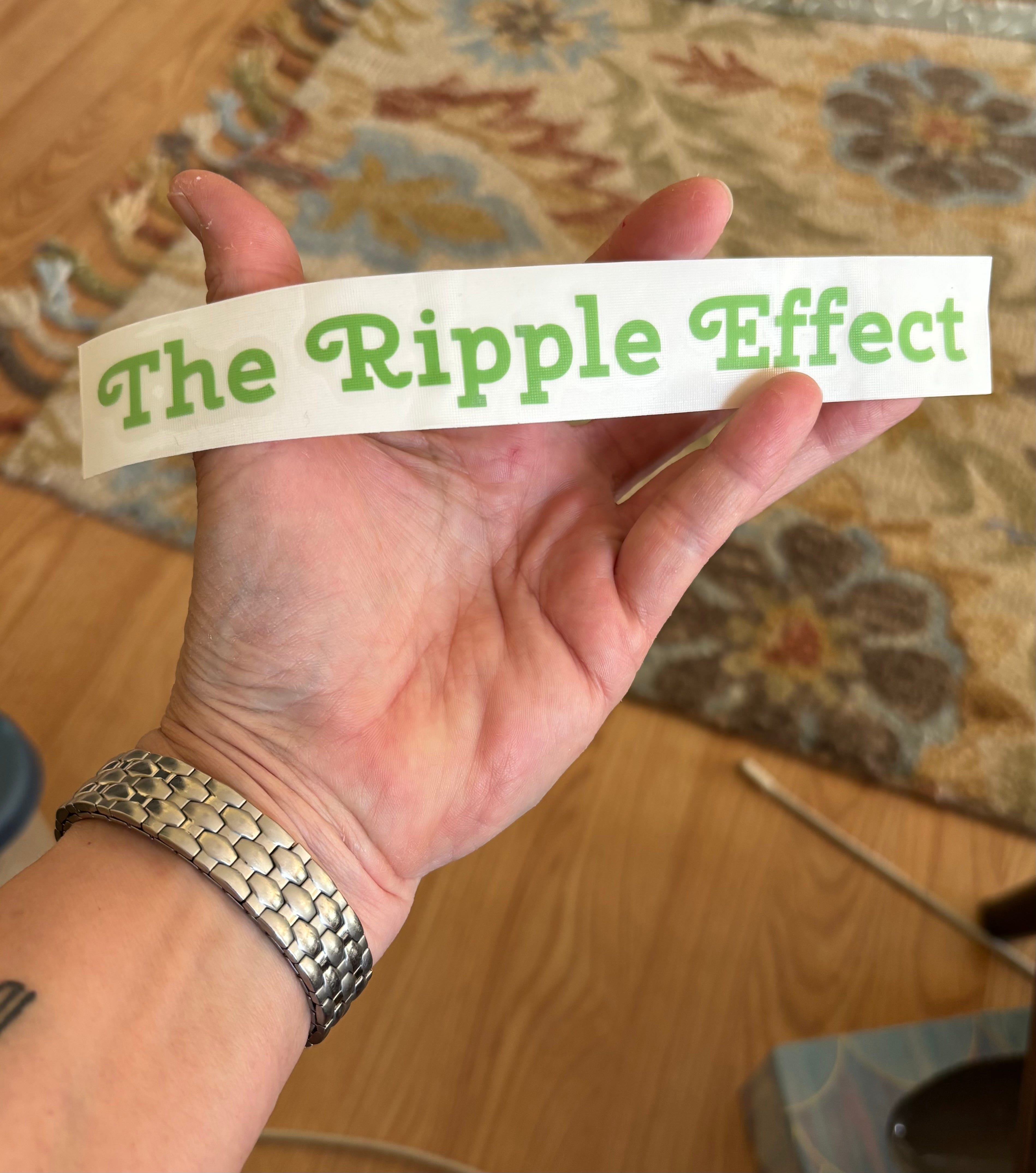 (Image is my hand holding up the very small vinyl transfer sticker I ordered, which says “The Ripple Effect” in 1 inch tall letters.)