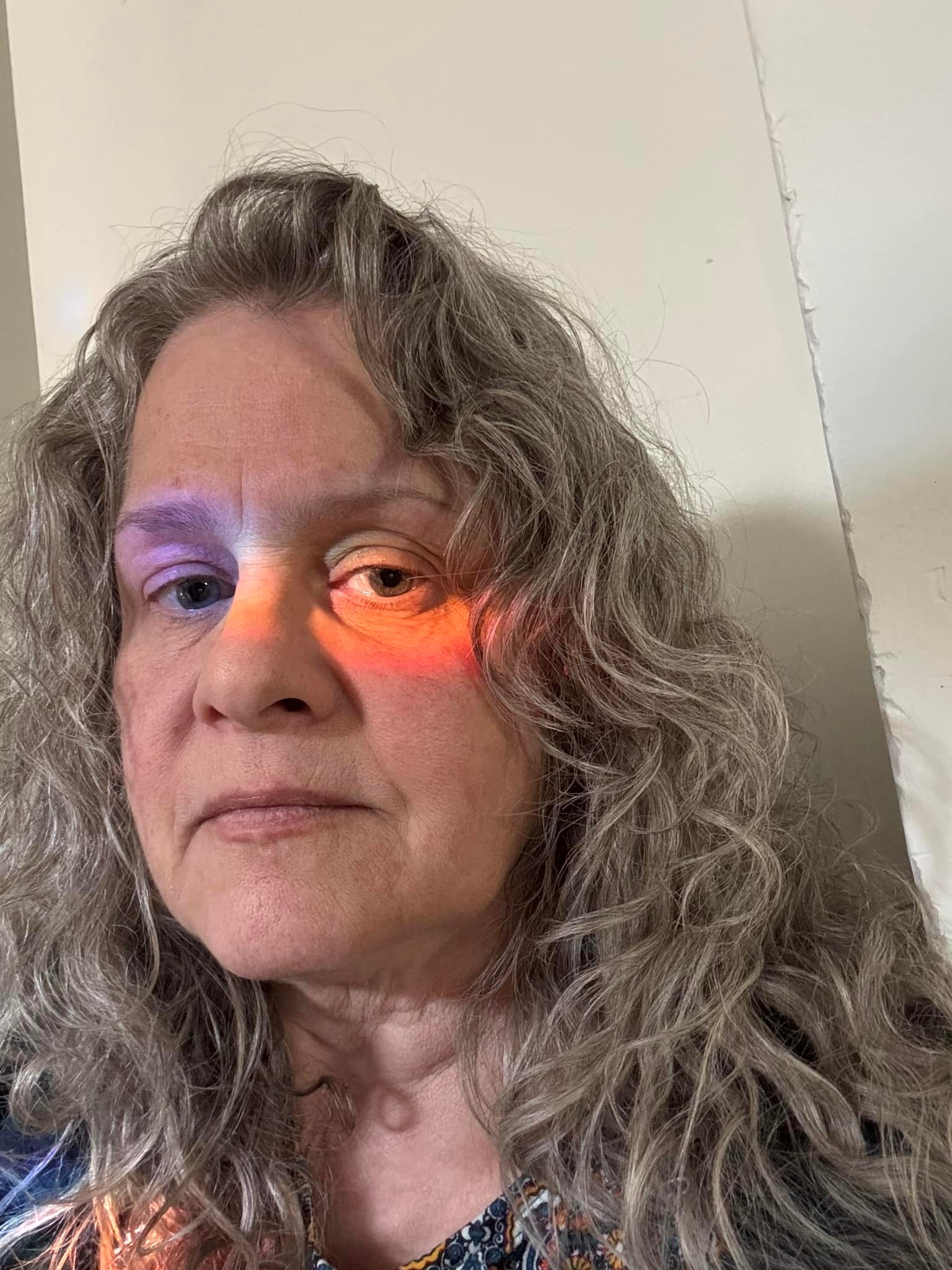 (Image is me, sitting with my back to the wall. A rainbow cast by a crystal lies across my eyes.)